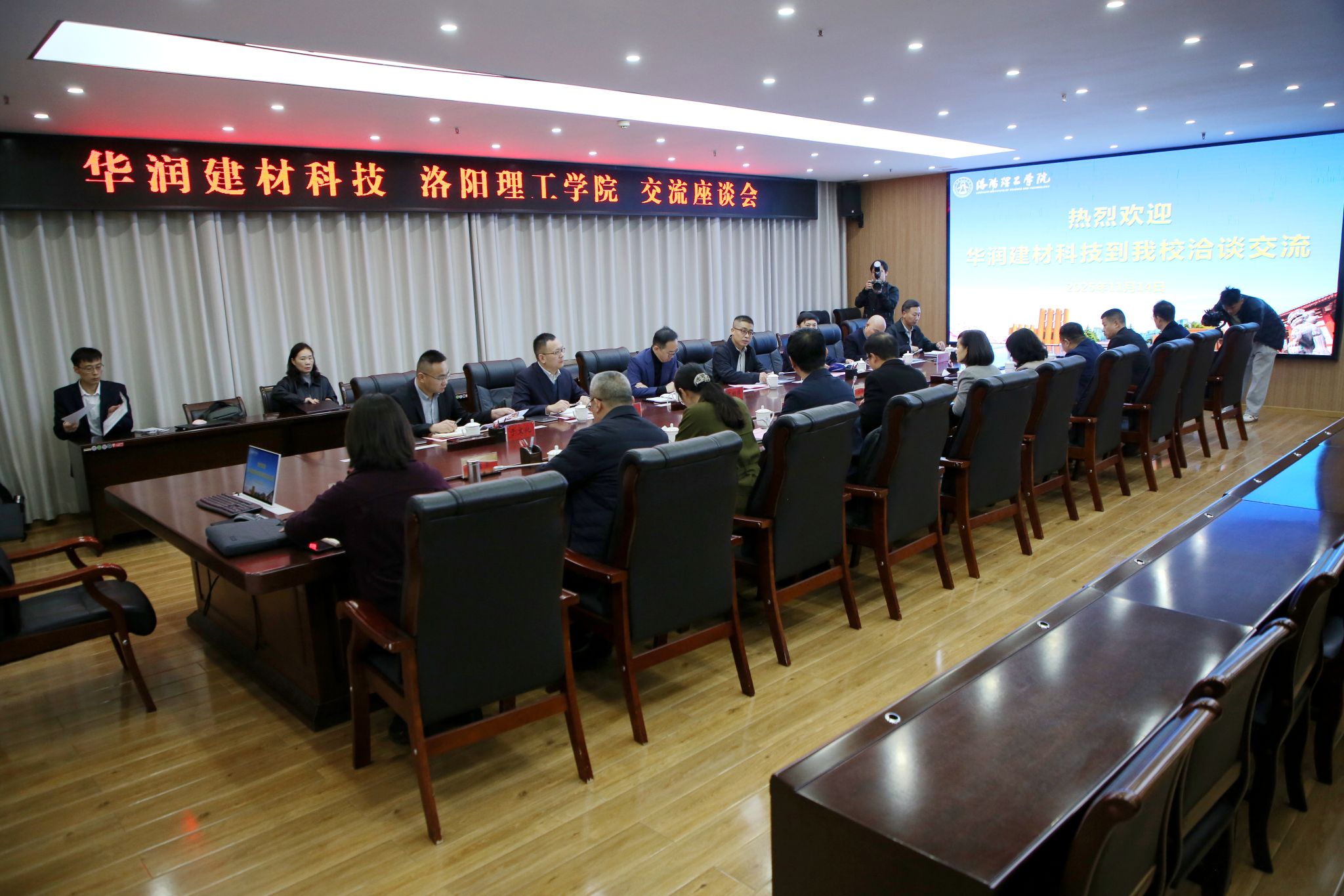 丁梧秀对华润建材科技控股有限公司一行的到访表示欢迎,简要介绍了学校办学历史、学科特色与发展成效,希望以此次交流为契机,与华润在人才共育、科技研发、成果转化等方面开展全方位、深层次合作。